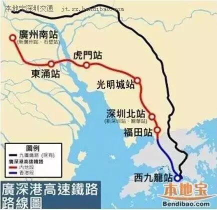 主要站点:广州南站、庆盛站(原名东涌站)、虎门站、光明城站、深圳北站、福田站和西九龙总站
