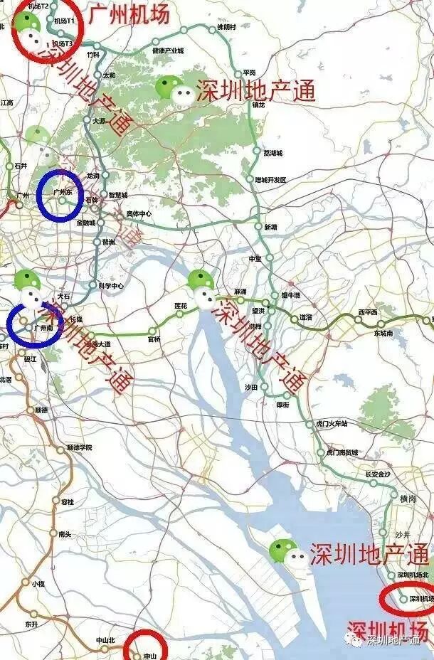 深圳机场到广州40分钟, 深圳机场至白云机场40分钟, 广州北站至白云机场7分钟。 “深圳-东莞-广州”城际起于广州北站,连通白云机场, 再经东莞至深圳机场,预留延长至南山前海湾、福田中心区。