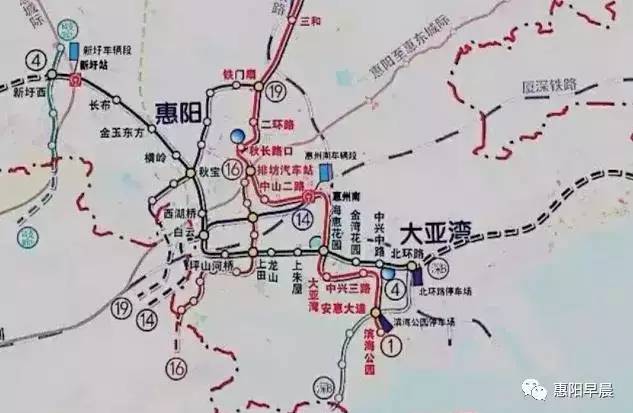 8号线:起于北环路(大亚湾),止于深惠边界。全长13.26公里,共设5个站,其中3个一般站,2个换乘站。 14号线:线路全长9.1公里,14号线(惠州段)线路起于惠州南站,沿爱民路、白云路、深汕公路敷设至深惠边界。 16号线:起于排坊汽车站,止于深惠边界。全长16.88公里,共设11个站,其中8个一般站,3个换乘站。 19号线:起于铁门扇,止于深惠边界。全长13.31公里,共设8个站,其中6个一般站,2个换乘站。 14支线(新21线):起于新圩,止于深惠边界。全长7.32公里,共设4个站,其中3个一般站,1个换乘站。
