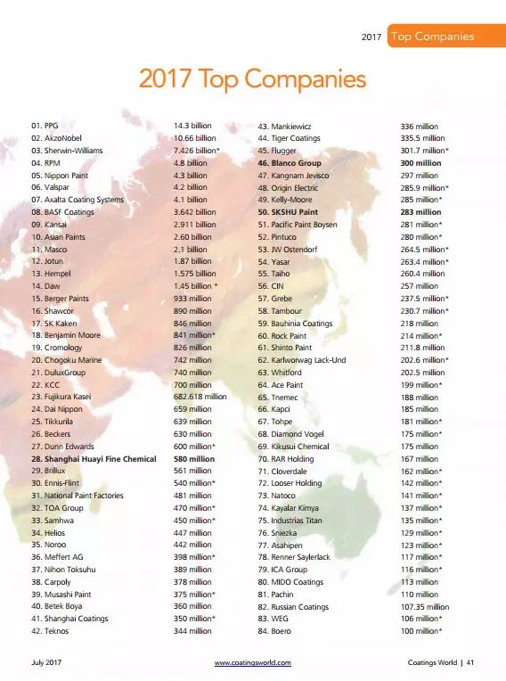 2017年全球顶级涂料制造企业销售额排行榜 销售额为:涂料及相关业务销售额 单位:亿美元 注:(1)榜单中28名上海华谊精细化工有限公司(Shanghai Huayi Fine Chemical)系由上海涂料有限公司(Shanghai Coatings Co.,Ltd.)更名演变而来。2015年2月6日,经上海闵行区工商局批准,原“上海涂料有限公司”正式更名为“上海华谊精细化工有限公司”。 (2)本榜单排行基于2016财年涂料及其相关业务的销售业绩,以美元结算。 (3)美国以外公司的销售额依据该公司本财年结束日期的汇率折算成美元。 (4)对于私人持有的公司未公布销售数字,由Coatings World准确估算,以*标注。 (5)上榜84家公司年销售额均超过1亿美元。